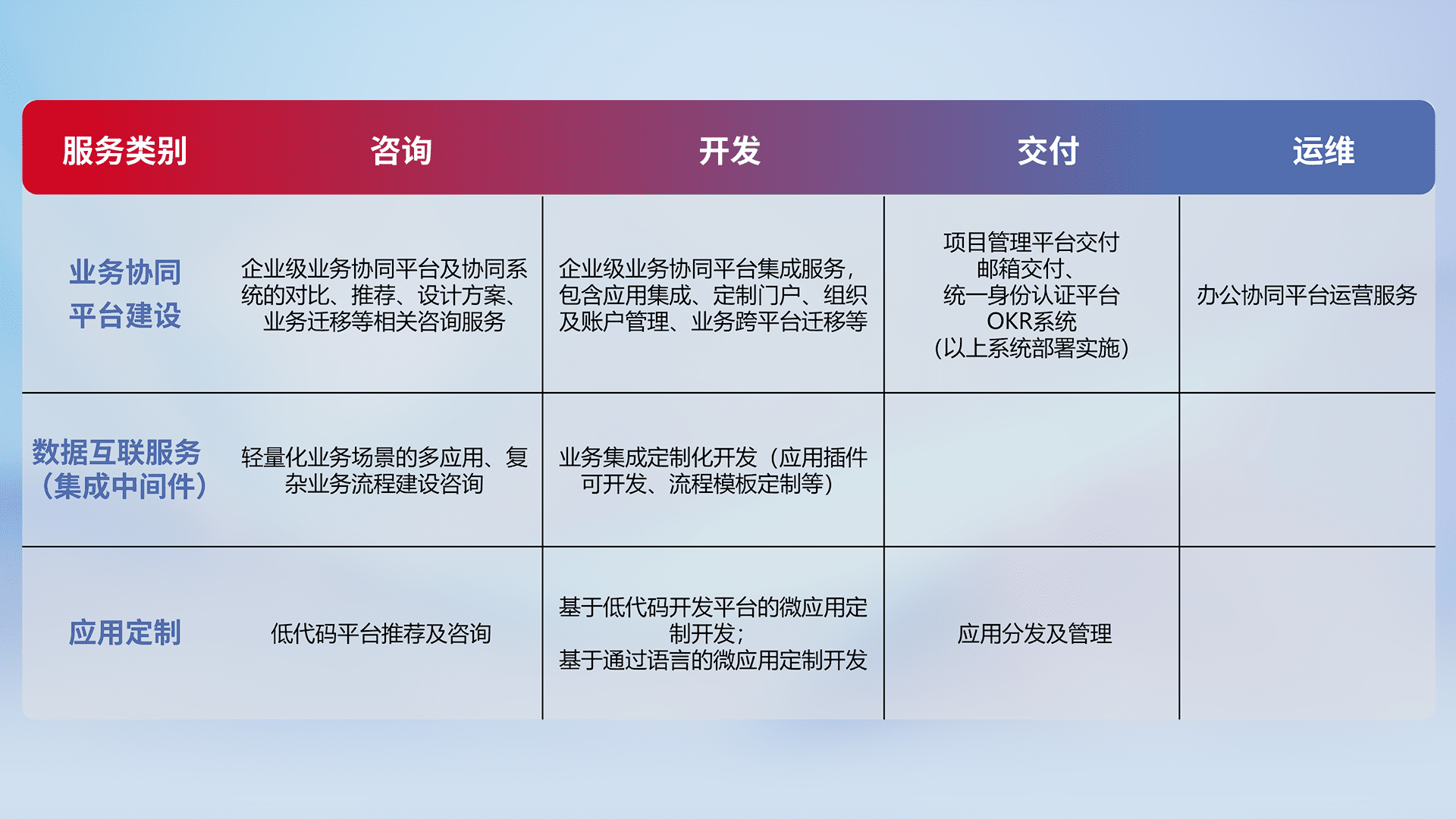 针对钉钉、、、企微、、IDaas等平台级产品提供产品的规划、、、方案、、交付、、、、定制化开发等服务,,实现如统一协同办公、、智能客户服务、、混合会议管理、、、智能数据查询、、、等业务场景,,实现数字化转型。。